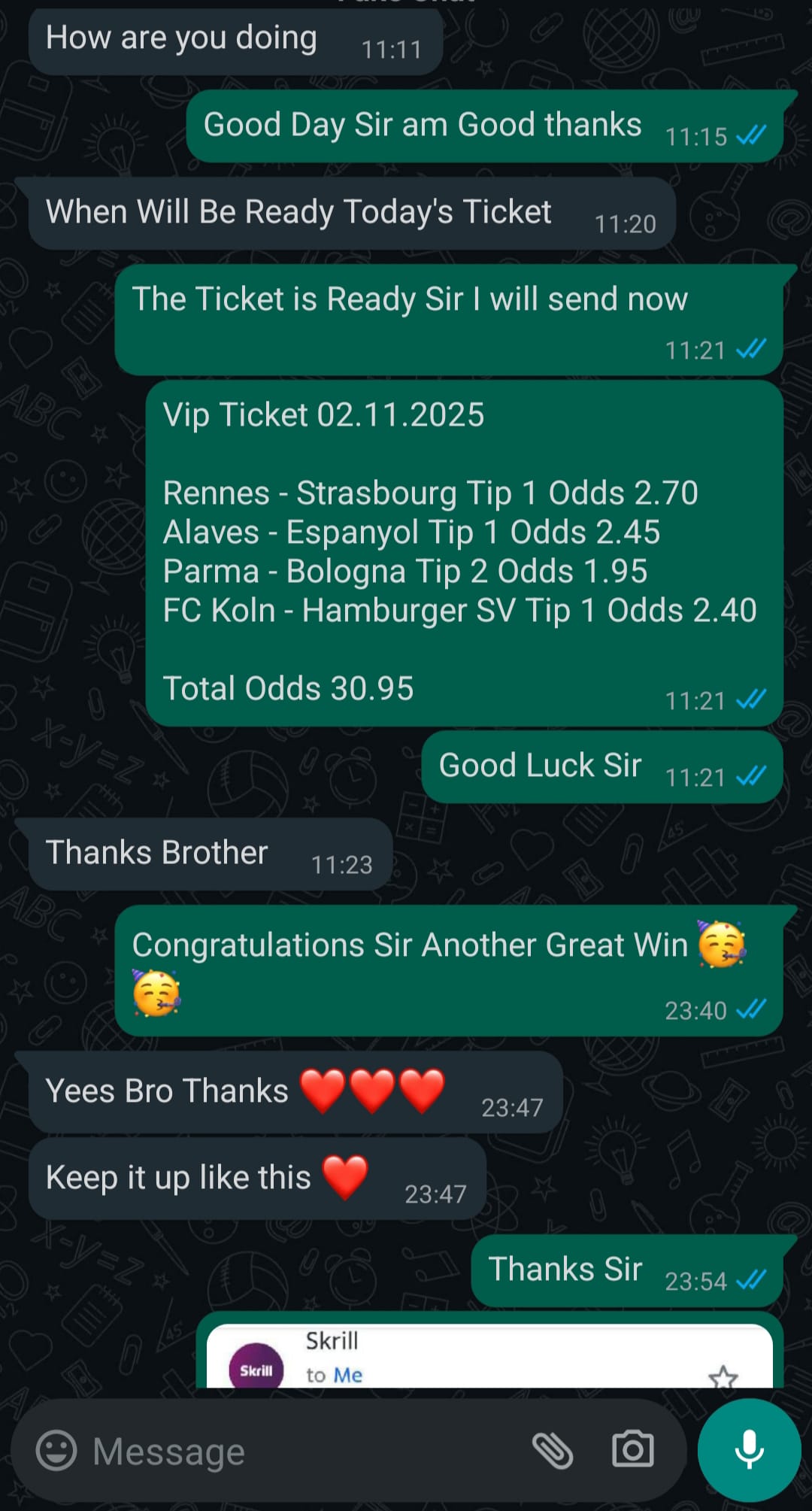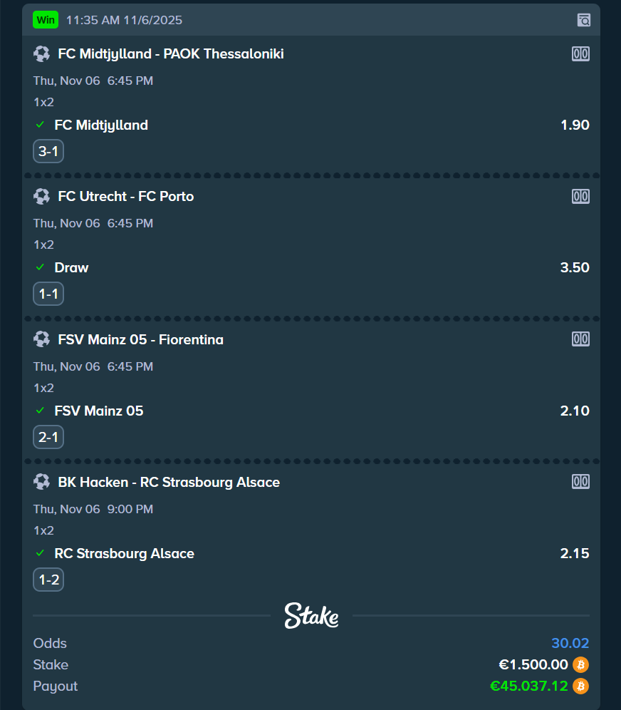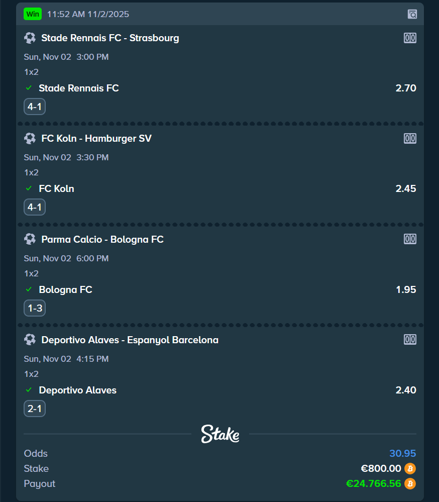 | 02.11.2025 | Rennes – Strasbourg | 1 | 2.70 | 4:1 | ||||